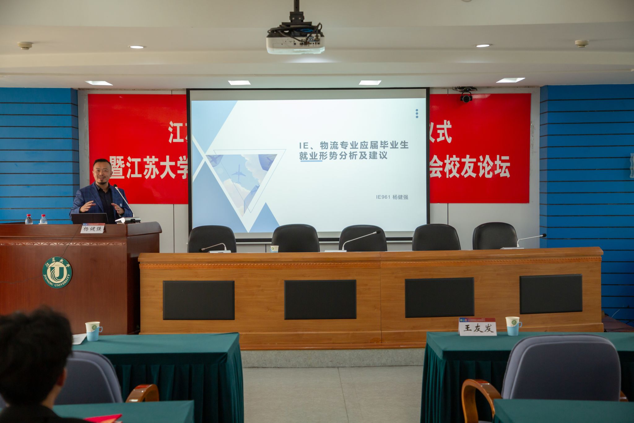 仪式中,彭永涛代表工业工程系致辞,他对工业96级校友对母院的关心和支持致以衷心的感谢,并号召广大在校学生以校友们为榜样,饮水思源,传递爱心;欧阳国庆代表学院向校友代表颁发了感谢状;单继宏代表工业96级校友致辞,抒发了对母校的感恩和对母校的深情祝福,简短而热烈的颁奖仪式结束后,工业1902班曾太贺龙代表获奖同学发表感言,表达了对母校和工业96级校友的敬意和感谢;欧阳国庆代表学院致辞,他衷心感谢工业96级校友对母院人才培养的关心支持,并勉励同学们以校友为榜样,铭记母校的教诲,谦虚其心,远大其志,踏实其行。最后,杨健强围绕“大学生就业前景与职业生涯规划”作了报告,并与同学们进行了互动交流。